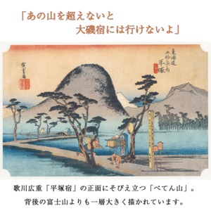 東海道五十三次の七番目の宿場町「平塚」は、当時たくさんの宿がありました。平塚の旅籠の客引きは旅人に、目の前に見える高麗山(湘南平)を指差し「あの山を超えないと大磯宿には辿り着けないよ」と云って旅人を宿泊させた。